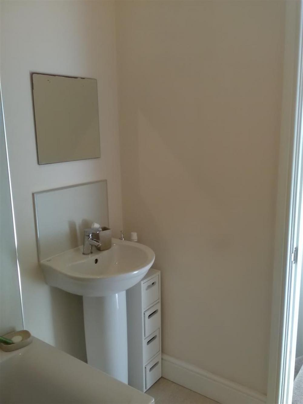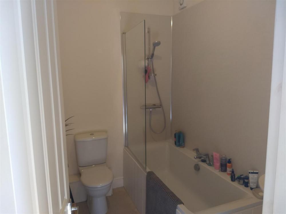 Three piece suite comprising panelled bath with shower over, wash basin, and low flush wc. Heated towel rail, extractor fan, tiled floor and part tiled walls.