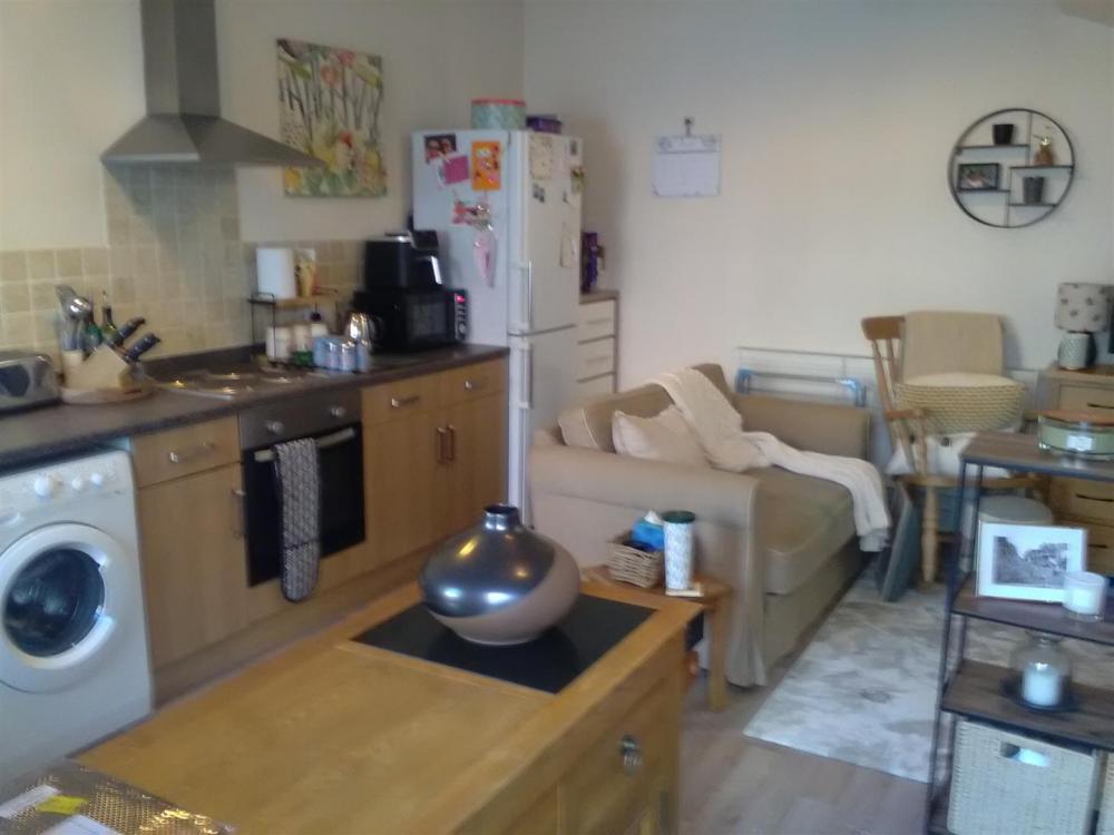Modern fitted kitchen with a stainless steel sink unit, electric oven and four ring hob with extractor hood over. Front aspect timber sash window, wood effect laminate flooring to the kitchen area, radiator. Open stair with balustrade leading to: