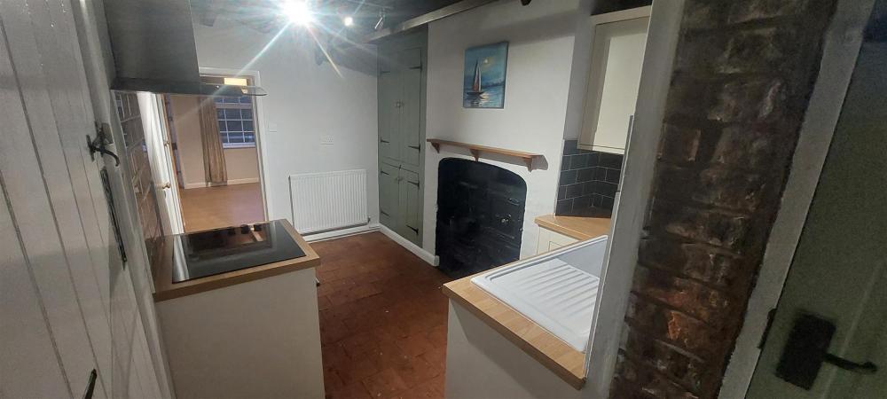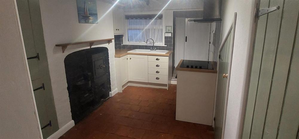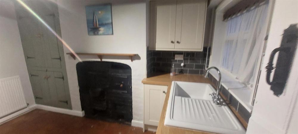 Rear aspect uPVC double glazed window, quarry tiled floor, beamed ceiling, feature cast iron range, recess under stairs cupboard. modern well appointed fitted kitchen, single drainer white ceramic sink unit, pantry cupboard with shelving and power. Single oven with grill and hob, and plumbing for a washing machine.