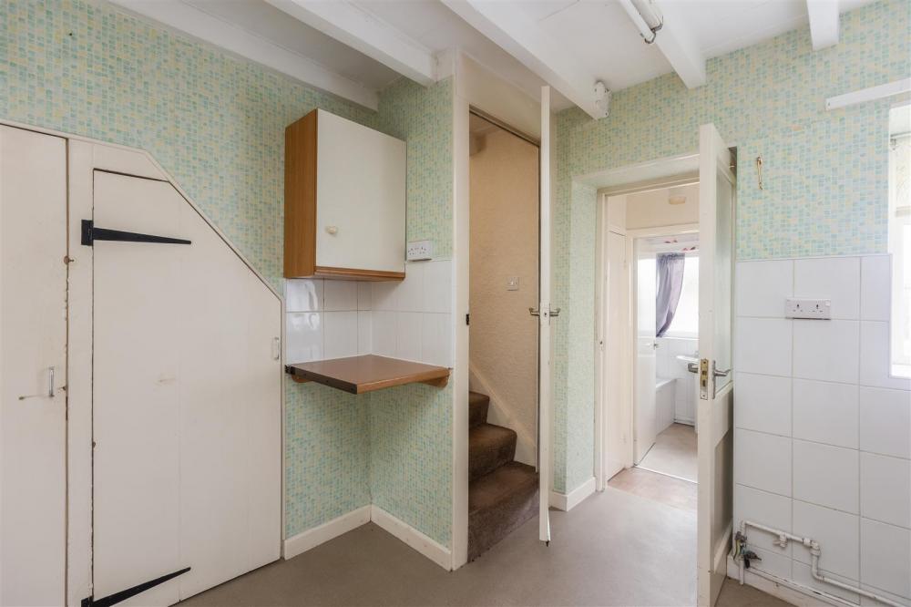 Fitted with a range of base and wall mounted units with work surfaces over, stainless steel sink and drainer with chrome mixer taps over, gas oven with 4 ring hob over, plumbing for washing machine. Under stairs cupboard and built-in shelving, airing cupboard housing the hot water tank and header tank, double radiator, rear aspect uPVC double glazed window, inner door to rear lobby providing access to pantry cupboard, and uPVC double glazed door to rear outside. Staircase to first floor.