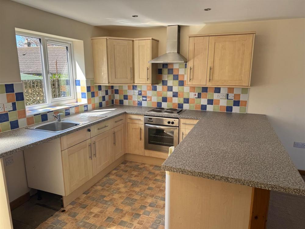 Kitchen with single drainer sink unit set within rolled edge work surfaces with mixer tap over, further wall and base units incorporating drawer compartments with tiled spalsh backs, built in oven with four ring hob and extractor canopy over, space for undercounter fridge, plumbing for automatic washing machine, central heating radiator, spot lighting to ceiling and door the rear garden. Door opening to cloakroom and understairs storage area..
