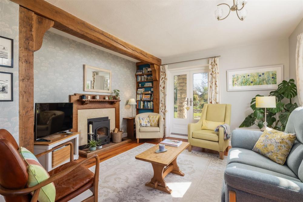 Triple aspect room enjoying delightful views over the garden, Inglenook style fireplace with oak beam over and Robert Thompson Mouseman Oak fireplace housing log burner set on hearth; oak book shelving to either side of the fireplace. Television aerial point, radiator and french doors leading to the covered Loggia and garden.
