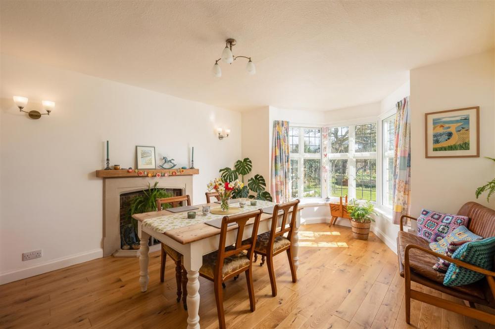 A beautiful room with deep walk in bay window enjoying views over the garden, further window to the side elevation. Feature fireplace with brick inset and polished timber mantle over. Alcove with wall shelving and cupboard beneath. Radiator, tongue & groove oak flooring. Wall light points.