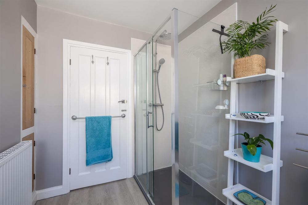 Recently re-fitted with suite comprising panelled bath with mixer taps, walk-in shower, wash hand basin and w.c. Built in wall cupboards, radiator, splash-backs, spot lights to ceiling, heated illuminated mirror and extractor fan.
