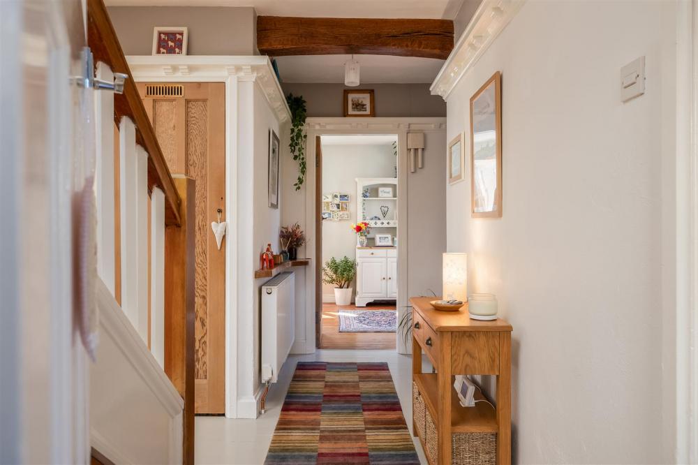 With oak front door having leaded light window, decorative delph rack, radiator with oak shelf over, tongue and groove flooring, elegant open turned staircase with oak handrail leading to first floor with half landing having beautiful stained glass window; side door leading to rear porch. Open beam to ceiling. Useful built in cloaks cupboard.