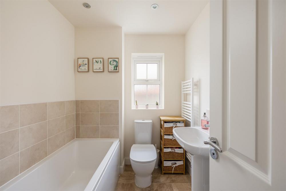Comprising panelled bath, pedestal wash hand basin, low flush w.c., partial wall tiling, heated towel rail and double glazed window to the side elevation.