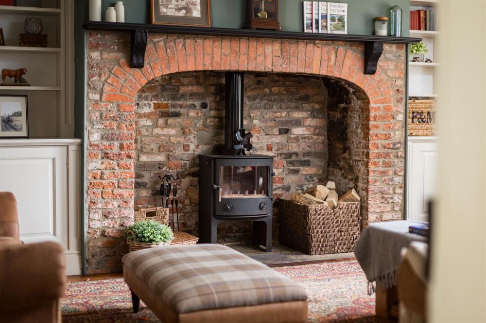 Wooden floor, handcrafted shelves to either side of fireplace and woodburner.