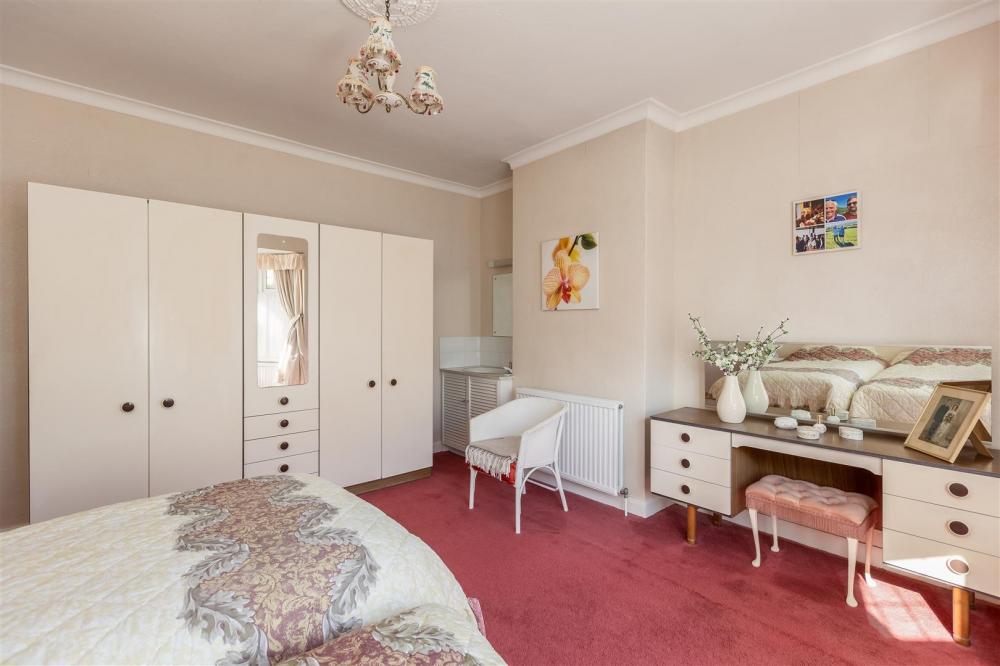 A large double bedroom with a vanity unit having wash hand basin and cupboard below, double glazed bay window to the front elevation, coving to ceiling and two central heating radiators.