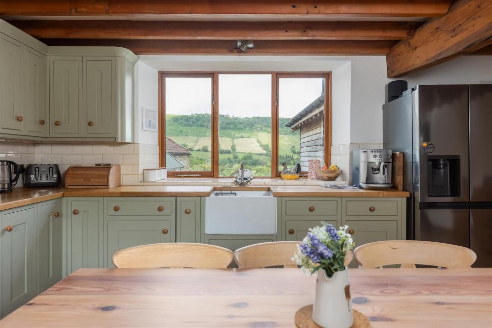 Dual aspect timber frame double glazed windows, range of bespoke fitted base and wall mounted units, Belfast sink with chrome mixer tap over, Rangemaster cooker into stone recess, integral dishwasher, exposed timber beams.