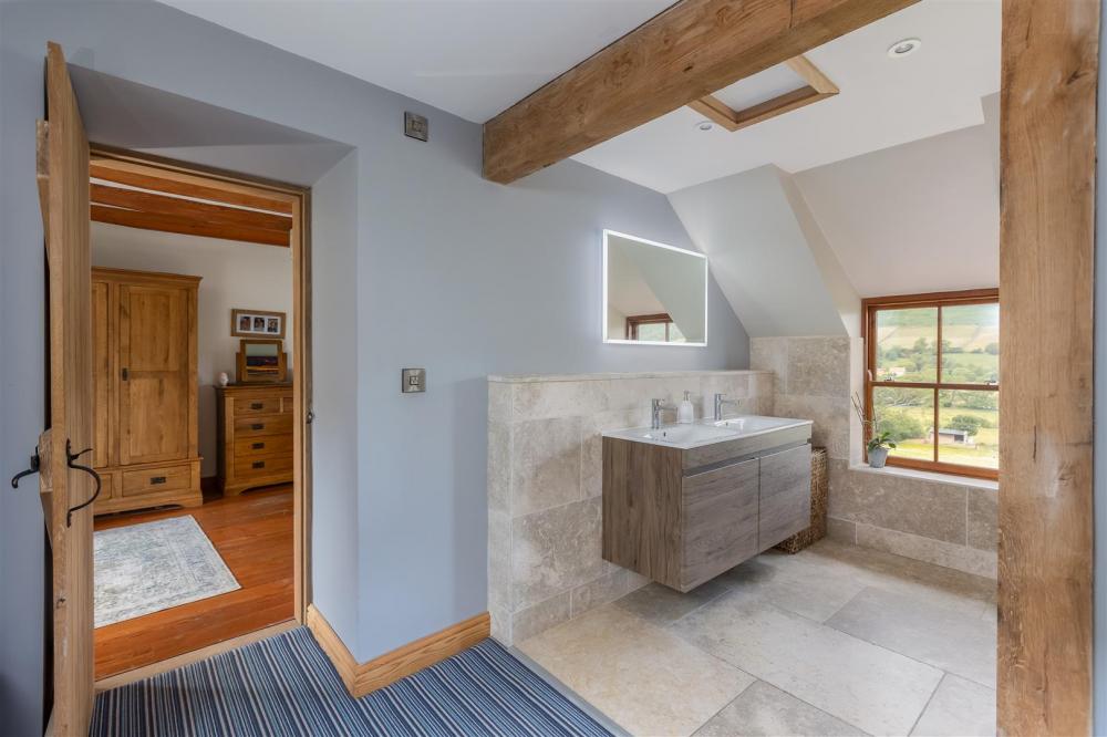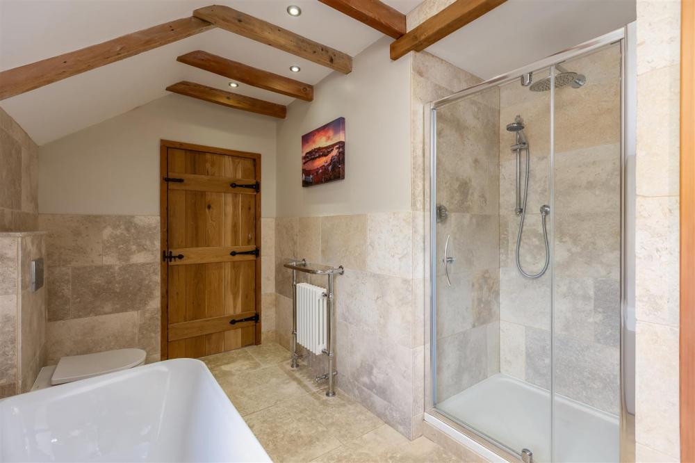 Rear aspect timber frame double glazed window, four piece suite comprising bath, shower cubicle with chrome fittings and glazed door, low flush wc, and wash hand basin, traditional column heated towel rail, fitted cupboard with shelving above, exposed timber beams, tiled floor and walls.