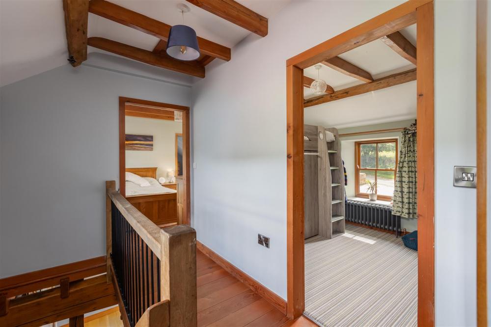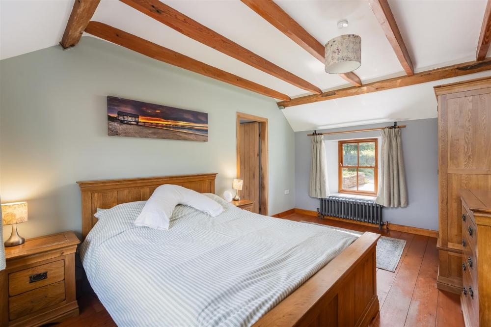 Dual aspect timber frame double glazed windows with sliding sash window to front, cast iron column radiator, exposed timber beams, door to: