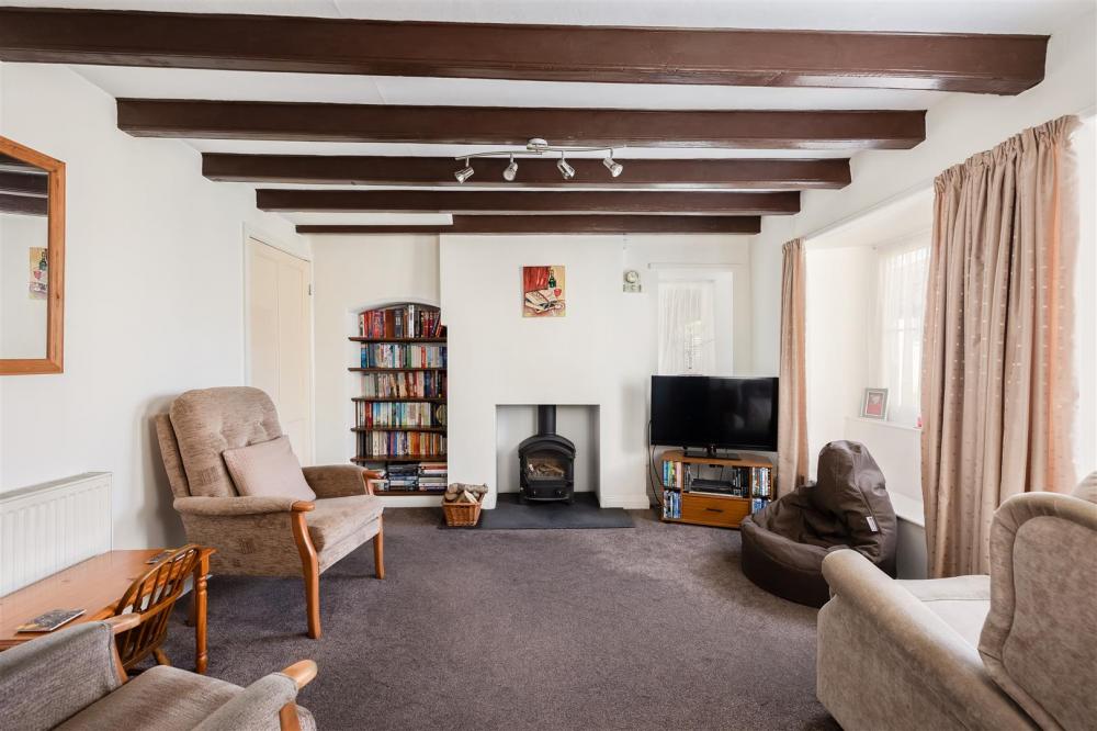 Side aspect uPVC double glazed window, steel wood burning stove on slate hearth, double radiator, timber beam ceiling, shelved alcove, rear aspect timber framed window.