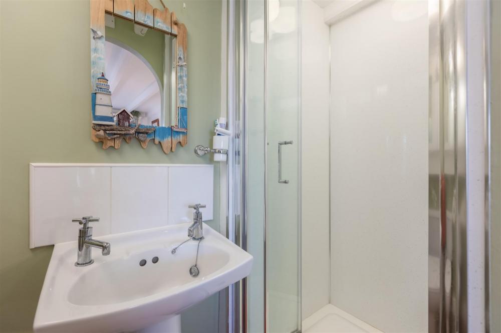 Comprising shower cubicle with shower unit and shower screen, pedestal wash hand basin, low flush w.c., central heating radiator, exposed timbers to ceiling.