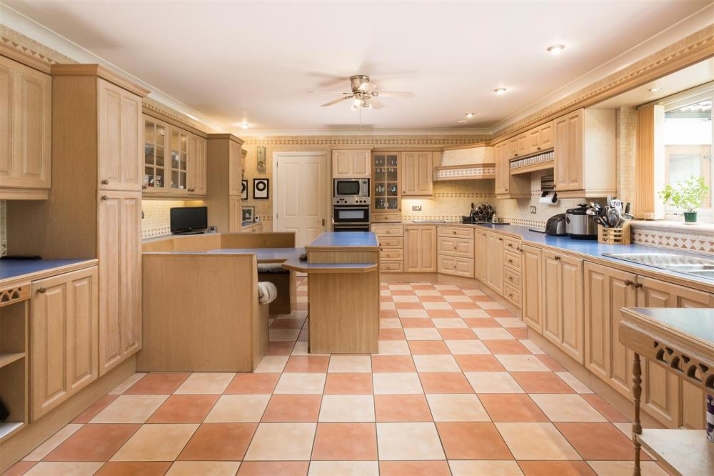 Fitted with a range of base and wall mounted units and work surfaces over, 1 & ½ bowl stainless steel sink and drainer with chrome mixer taps over, integrated double oven and microwave oven over, electric hob and extractor hood, built-in breakfast bar and seating area, tiled floor, and rear aspect uPVC triple glazed window.