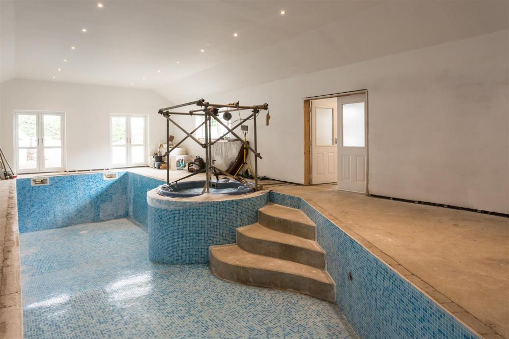 Currently undergoing refurbishment, this custom designed area includes swimming pool, hot tub, and twin uPVC double glazed French doors to the outside, and uPVC double glazed windows to the front and side aspects.