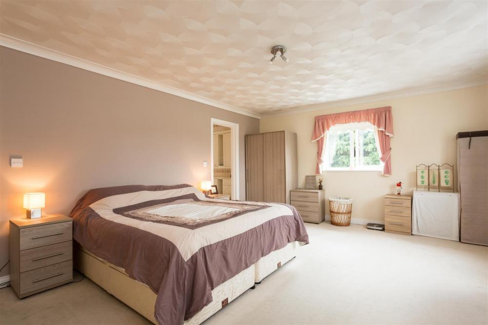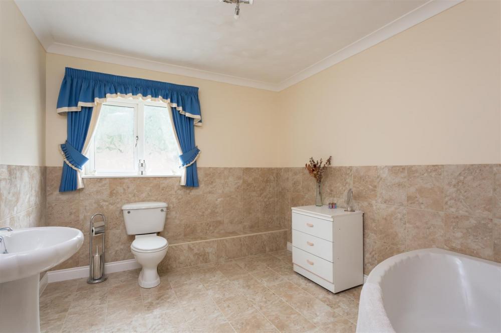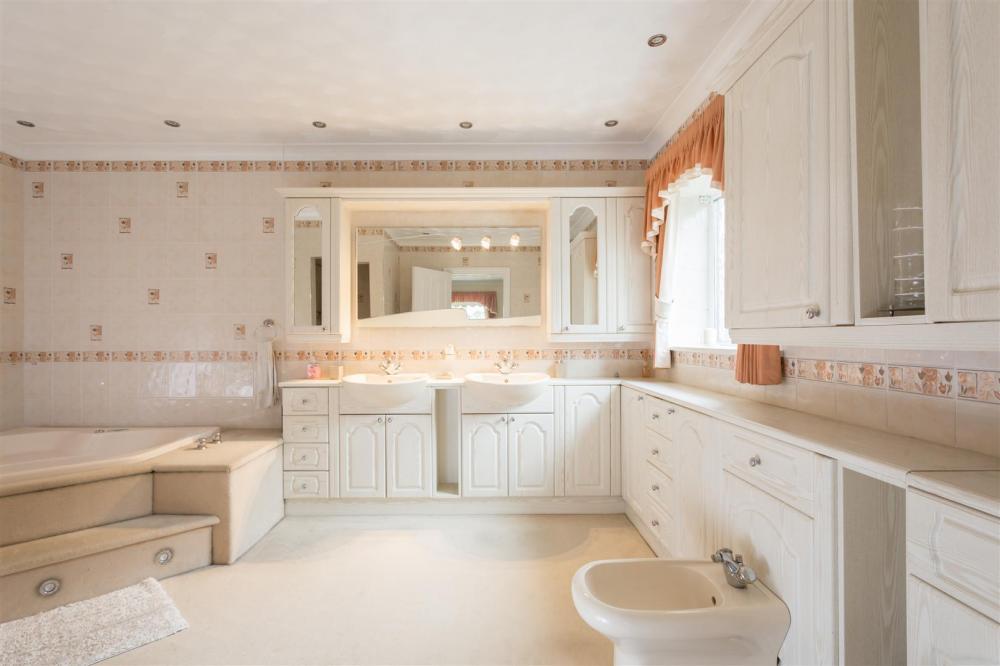 A five-piece suite comprising corner bath, double wash hand basins, low flush wc, bidet, and enclosed shower cubicle. Rear aspect uPVC opaque triple glazed, fully tiled walls.