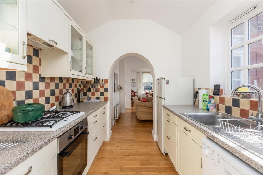 Housing a range of shaker style units comprising single drainer sink unit, rolled edge work surfaces, tiled splash backs, wall and base units incorporating drawer compartments, display cabinets, four ring gas hob with extractor fan over, built in oven, space for dishwasher, window to the side elevation with tiled window sill, skylight widnow.