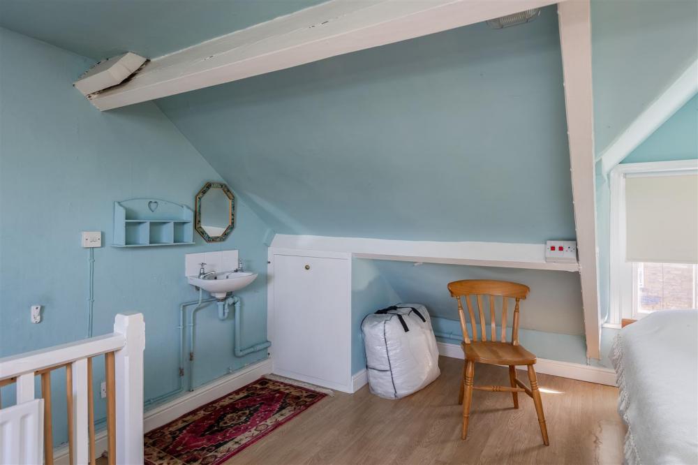 Having sash window to the front elevation, exposed timbers, skylight window, laminate flooring, built in cupboard, wash hand basin with tiled splash backs.