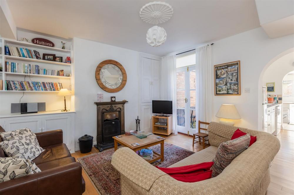 Sitting room with fireplace and open dog grate, original cupboards, shelving, chinese oak flooring, french doors to outside. Ceiling rose, understairs storage cupboard and central heating radiator.