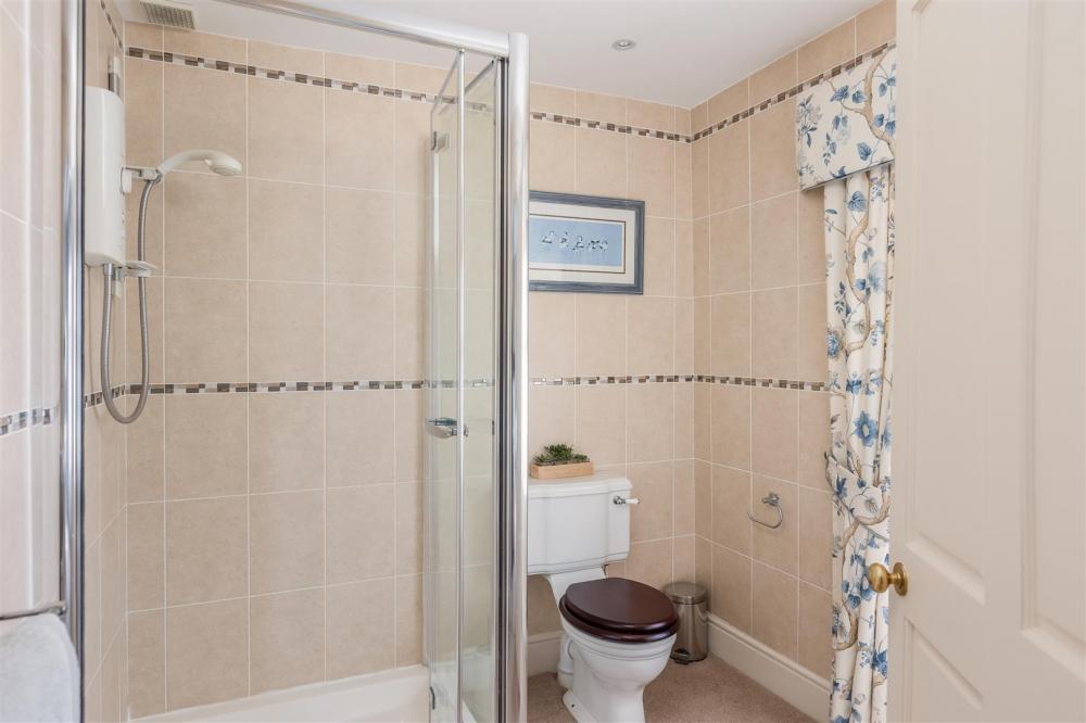 With crook beams, double glazed window, fitted wardrobes and cupboards, built in cupboard, two double glazed velux window, central heating radiator. Steps down lead to en-suite bathroom.