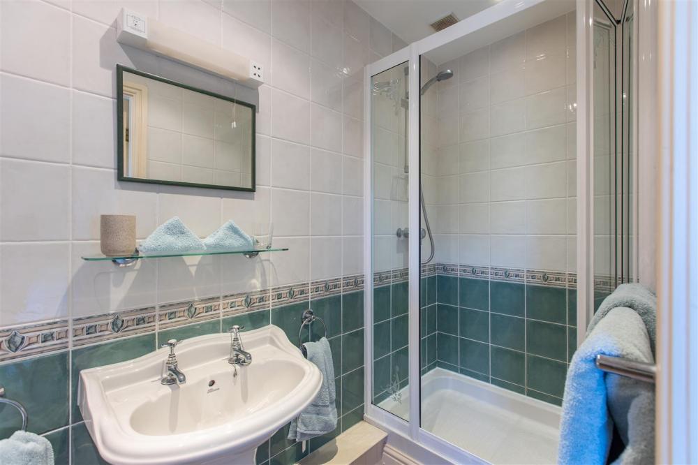 Shower cubicle with shower unit, pedestal wash hand basin, low flush w.c, wall tiling, double glazed velux window and central heating radiator.