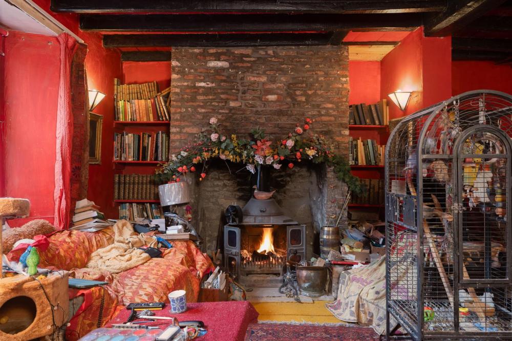 Beam ceiling, feature cast iron fireplace, built in cupboard.