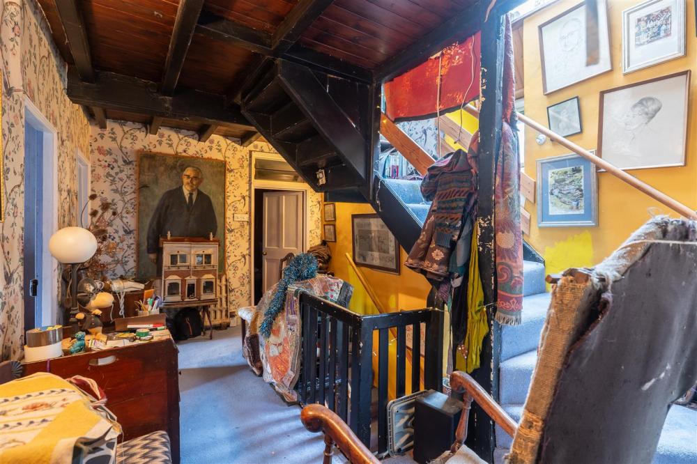 Solid fuel cast iron stove, beam ceiling, stairs to first floor.