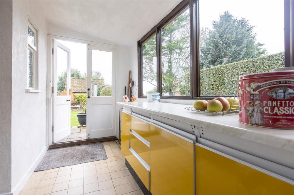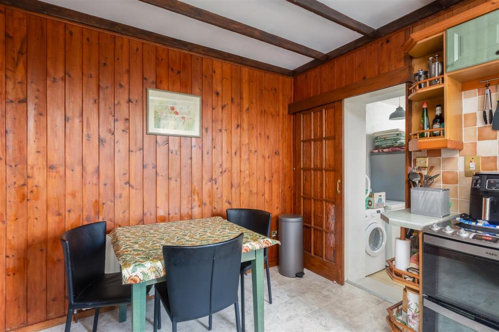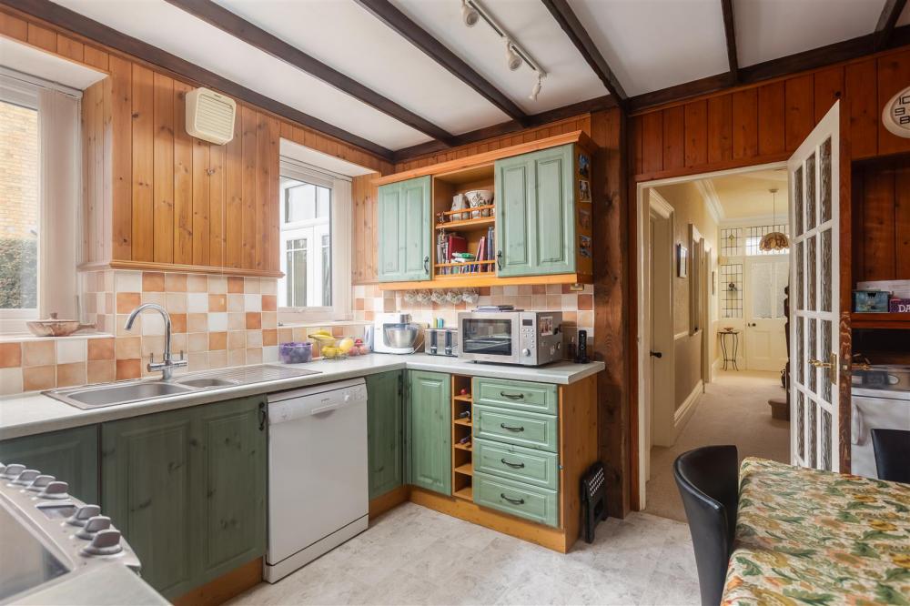 Comprising 1 1/2 bowl drainer sink unit set within rolled edge work surfaces with mixer tap over, wall and base units incorporating drawer compartments with tiled splash backs, wine rack, display shelving, plumbing for dishwasher, two double glazed windows to the side elevation with tiled window sills. Exposed beams to ceiling, part wood panelling to walls, central heating radiator and electric cooker point.