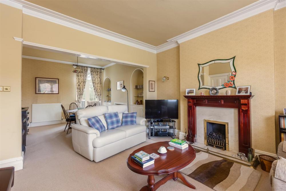 Sitting area with feature fireplace having wooden surround, marble back and hearth, gas fire, coving to ceiling, ceiling rose, central heating radiator, sash bay window to the front elevation.