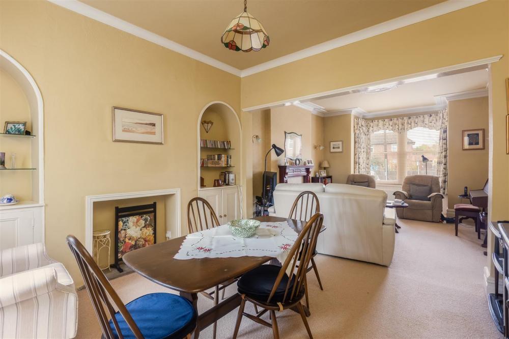 Dining area with fireplace with cupboard, archway and shelving to either side of the chimney breast. Central heating radiator, coving to ceiliing, double glazed double doors lead to the rear garden.