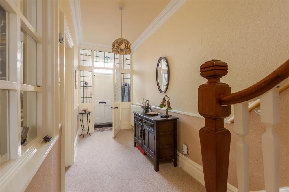 With dado rail, coving to ceiling, central heating radiator, stairs to first floor landing, understairs storage cupboard, feature window to sitting room/dining area.