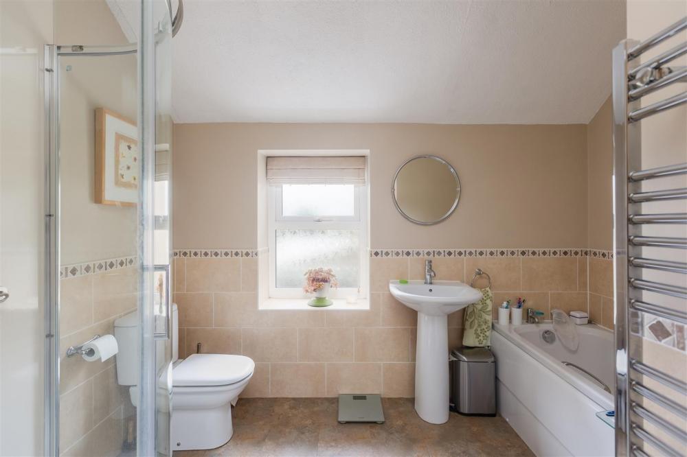 With panelled bath, separate shower cubicle with shower unit, pedestal wash hand basin, low flush w.c., partial wall tiling, tiled window sill, double glazed window to the side elevation , chrome heated towel rail and built in airing cupoard housing hot water cylinder and additional built in cupboards.