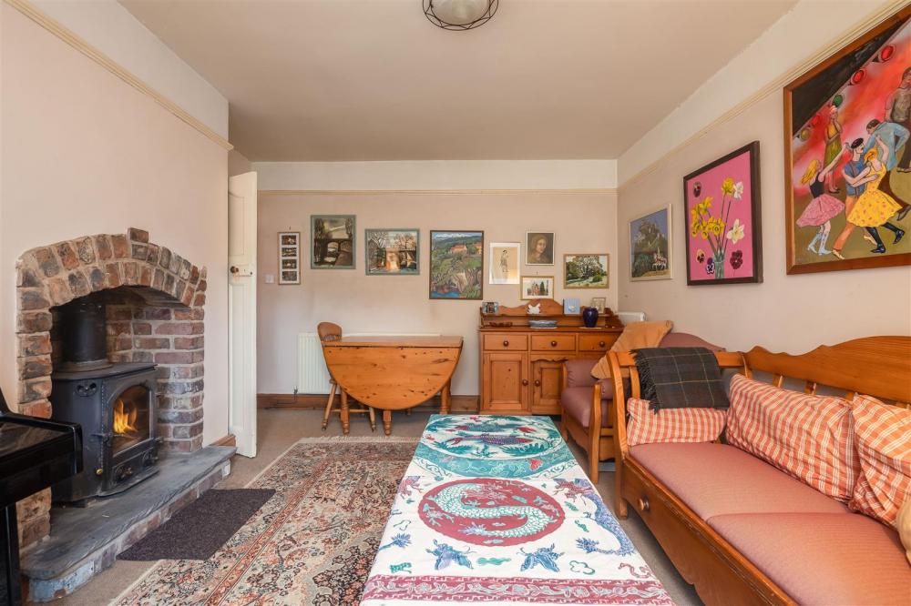 Rear aspect uPVC double glazed French doors; feature brick fireplace with cast iron multi-fuel stove; picture rail; single radiator.