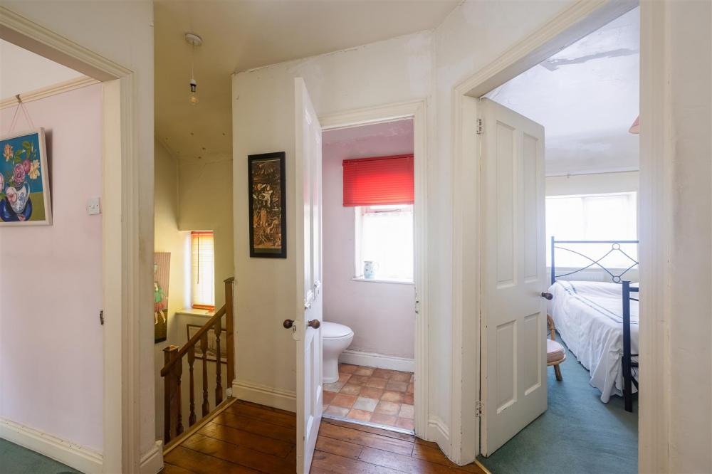 Rear aspect timber frame opaque single glazed window; two piece suite comprising panelled bath with traditional telephone-style shower mixer faucet; pedestal wash hand basin; part tiled walls, single radiator.