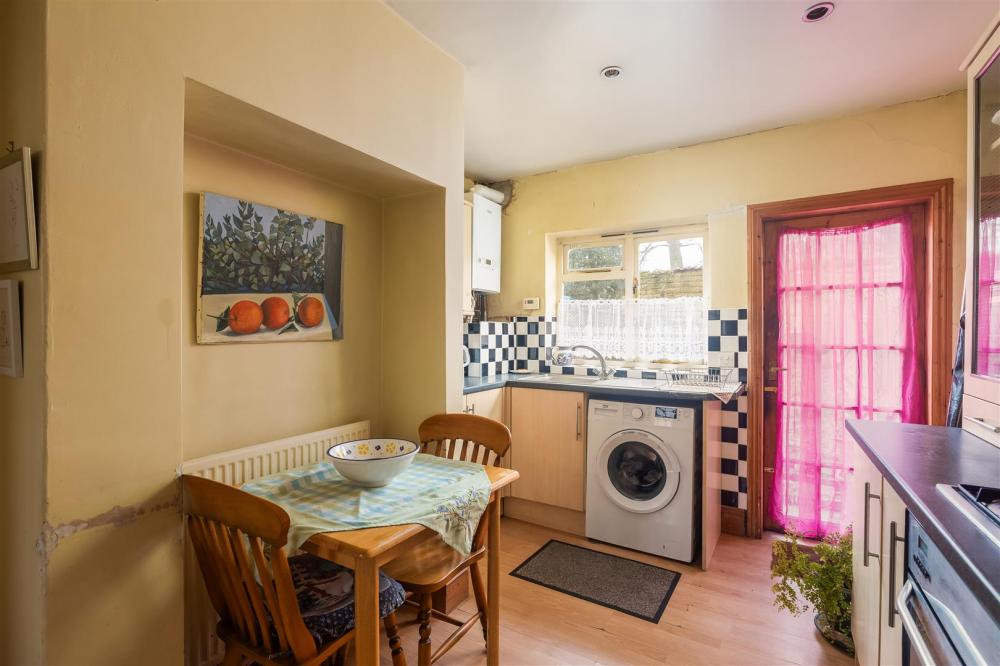 Rear aspect timber frame door with glazed units and timber frame single glazed window; range of base and wall mounted units; stainless steel sink and drainer with mixer tap over; built-in oven; 4 ring gas hob; plumbing for washing machine; Ideal Logic gas combi boiler; single radiator.