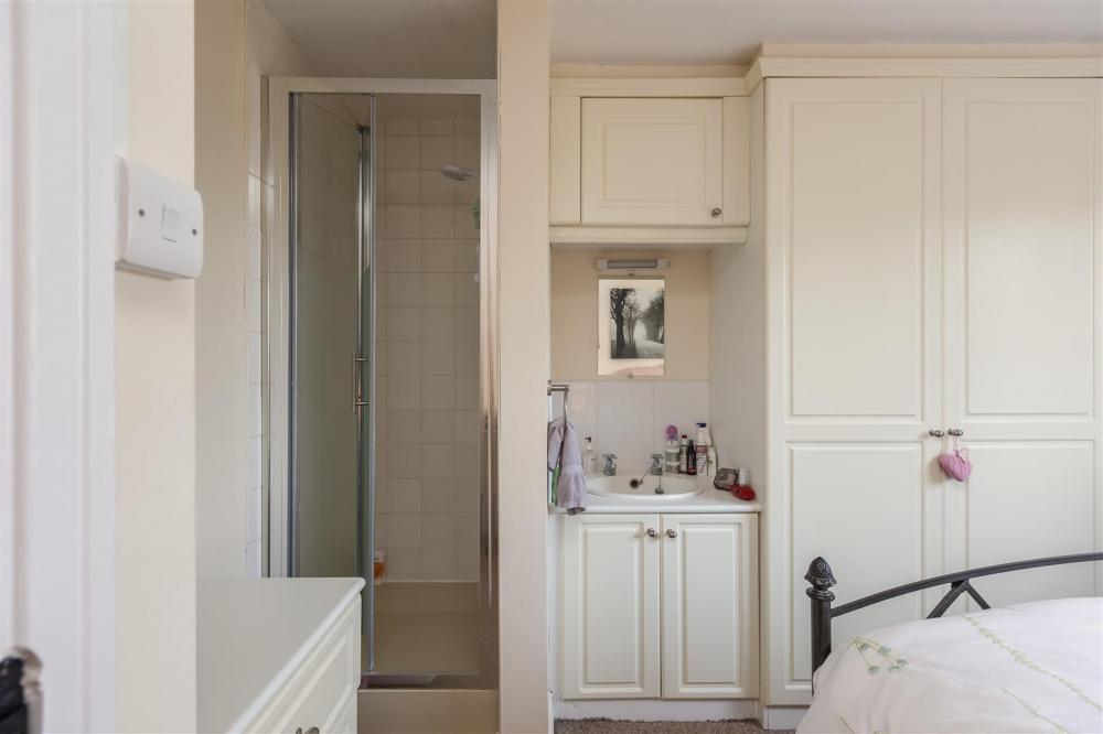 With double glazed window to the front elevation, shower cubicle with shower unit, vanity unit with inset wash hand basin and cupboards below, wall mounted electric heater and fitted wardrobes.