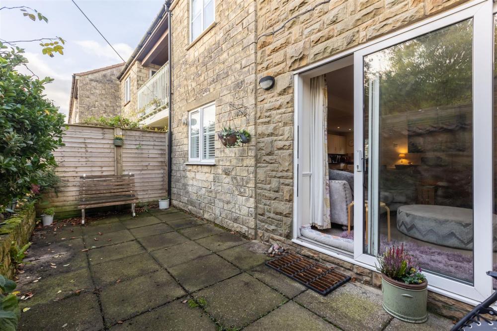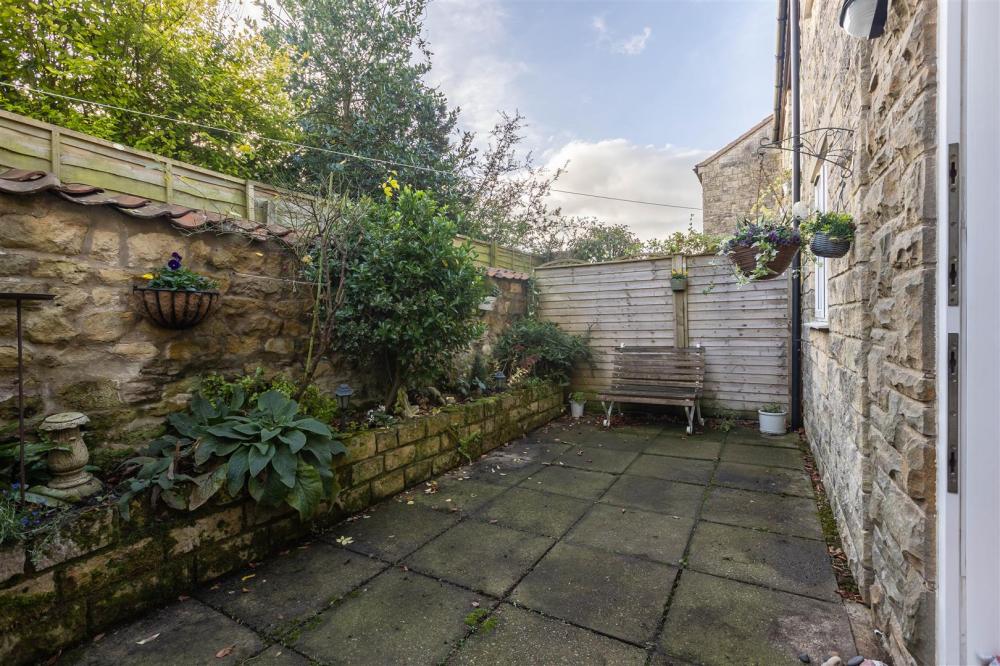 Enclosed Courtyard garden to the rear being paved with raised flower/shrubbery bed and retaining stone wall.