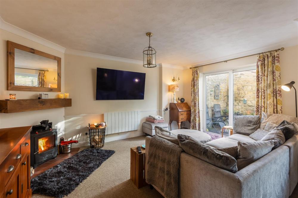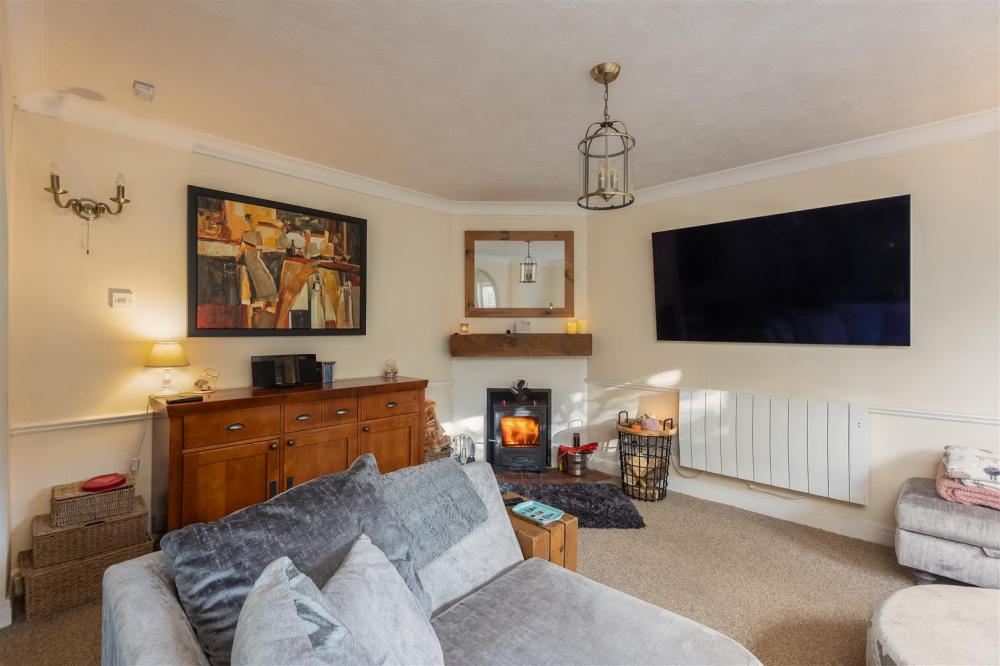 With feature fireplace having wooden mantle, tiled hearth, multi burning stove, dado rail, coving to ceiling, double glazed patio doors leading to the rear courtyard garden.