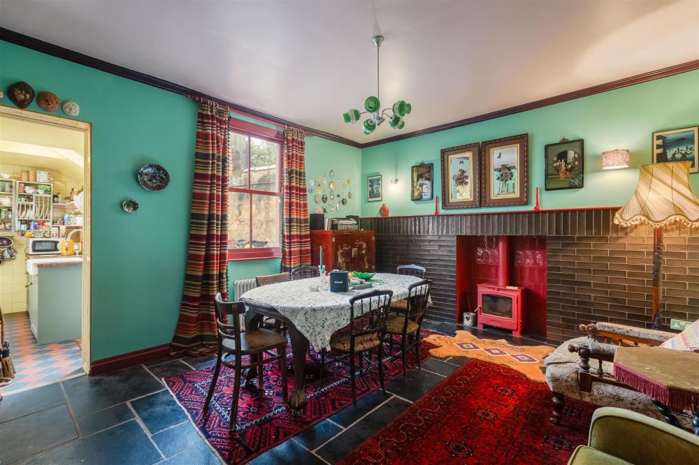 Having feature fireplace, tiled hearth, multi burning stove, wall mounted ladder style radiator, window to the rear elevation, understairs storage cupboard, coving to ceiling and additional radiator and tiled flooring.