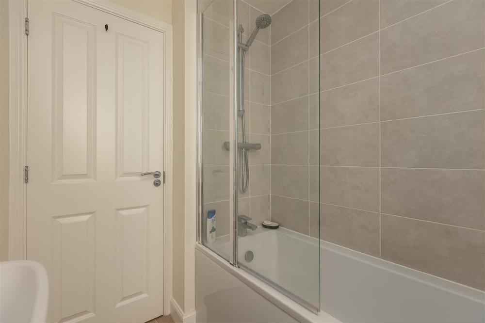 Comprising panelled bath with shower attachment over, pedestal wash hand basin with tiled splash backs, partial wall tiling, tiled window sill, low flush w.c., spot lighting, ladder style heated towel rail and double glazed window.