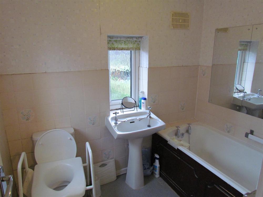 Comprising panelled bath, shower unit over, pedestal wash hand basin, low flush w.c, partial wall tiling, two double glazed windows and central heating radiator.