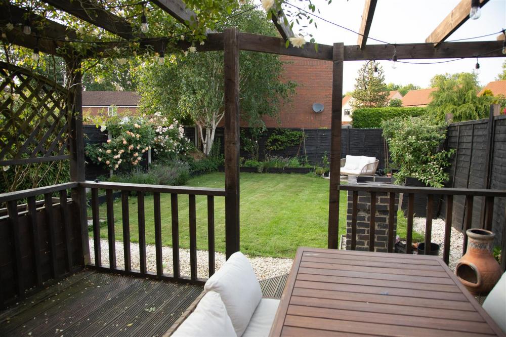 To the front, there are open lawned gardens with private driveway to the side. To the rear, there is an enclosed lawned garden with herbaceous borders and raised beds, together with decking area and pergola.