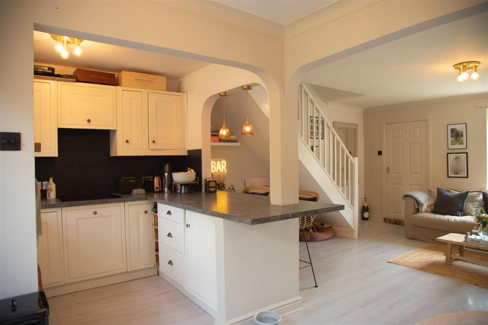 Dual aspect with uPVC double glazed window to the front and uPVC double glazed French doors and window to the rear, multi-fuel wood burning stove, wall mounted electric heater, staircase to first floor. The kitchen area comprises stainless steel single sink and drainer with chrome mixer tap over and set within rolled work surfaces, tiled splash backs, range of fitted base and wall mounted units, built-in oven and microwave oven, four ring hob with extractor hood over.