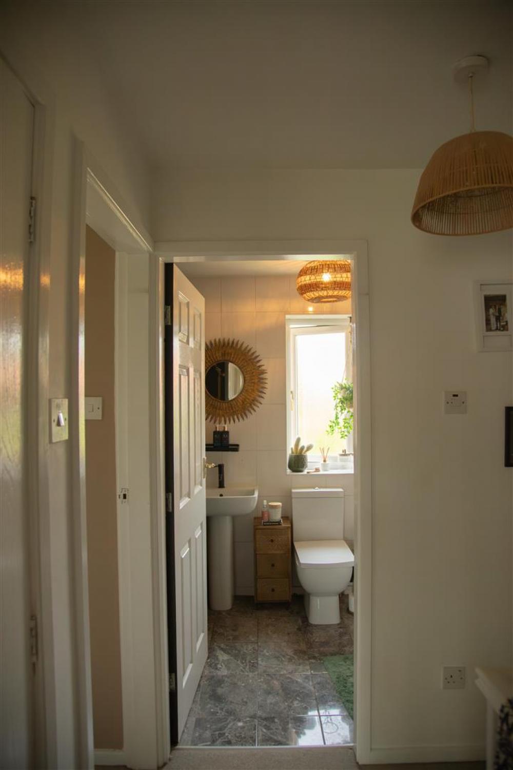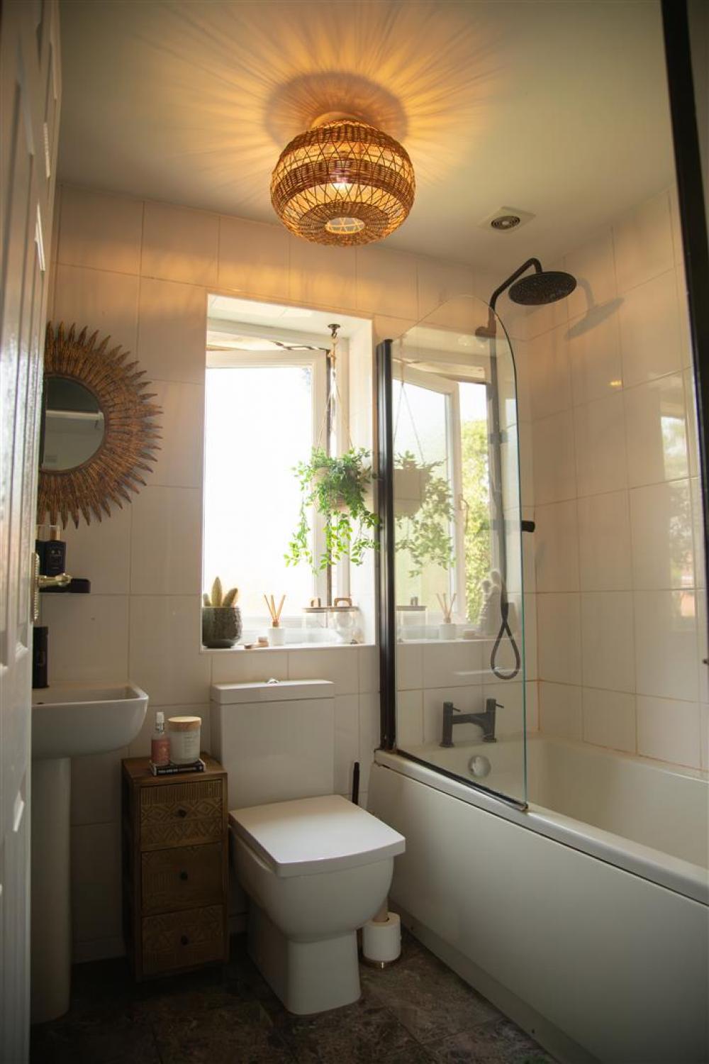 Rear aspect uPVC double glazed window, three piece suite comprising panelled bath with shower over, pedestal wash hand basin and low flush w.c., part tiled walls and tiled flooring.