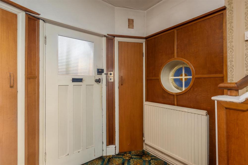 Timber entrance door, staircase to first floor, double radiator, timber panelled walls, built-in cupboards.