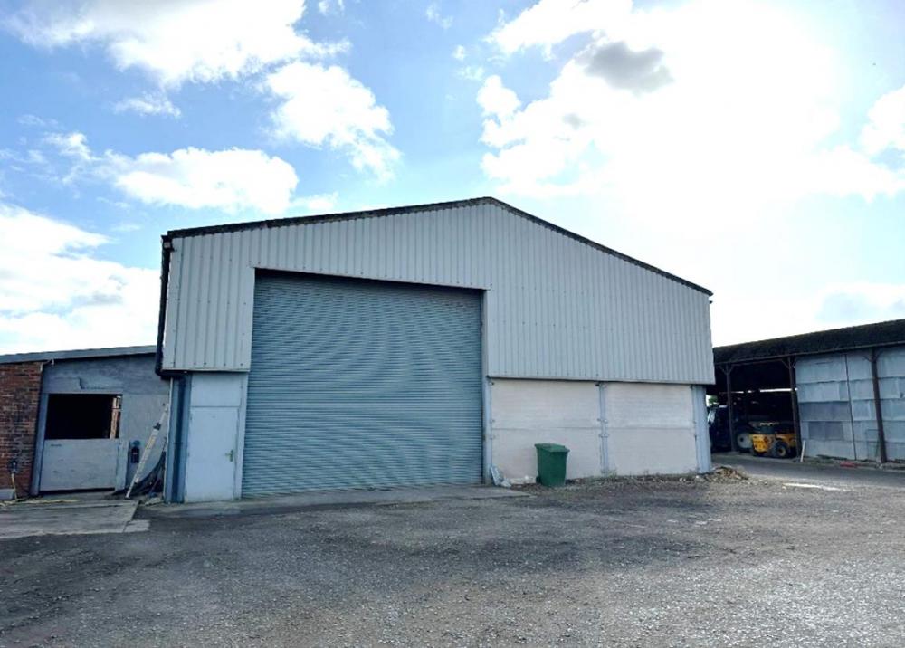 Grain store with concrete panel walling to 3m with sheeting above, concrete floor under a sheet roof. There is a roller shutter door to the front. The building has electric.