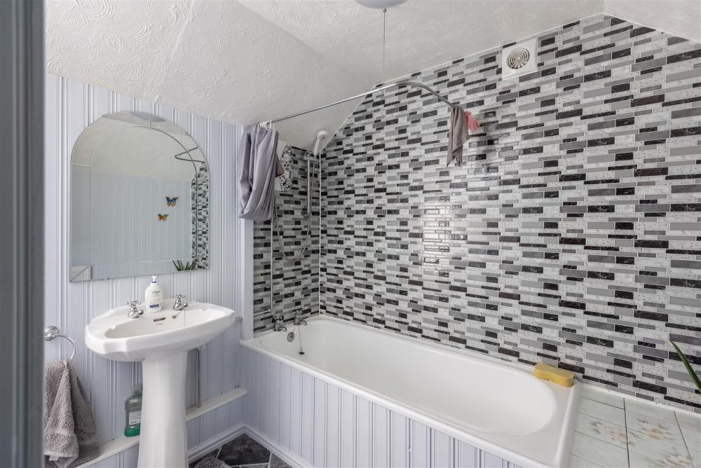 Front aspect uPVC double glazed window, three piece suite comprising panelled bath with Gainsborough electric shower over, low flush wc and pedestal wash hand basin, part tiled walls, double radiator, extractor fan.
