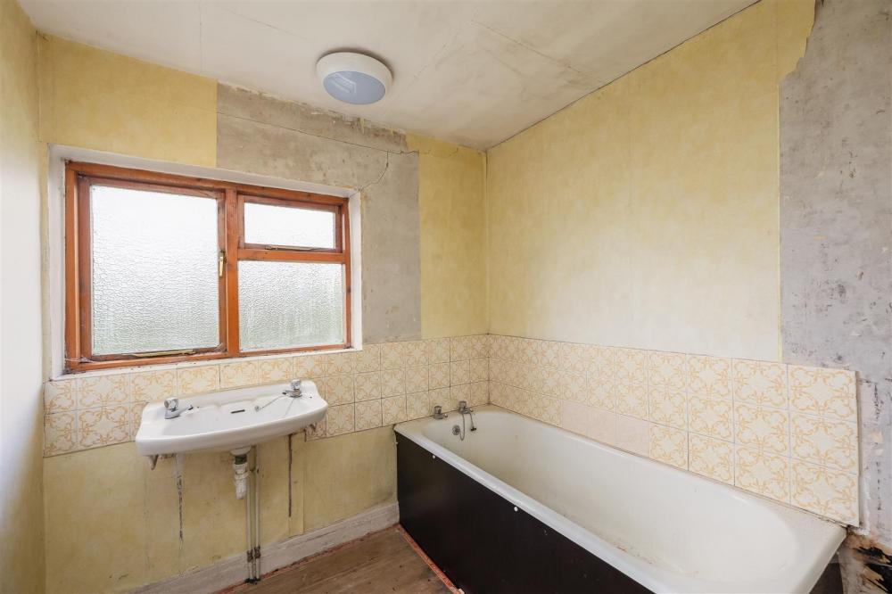 Rear aspect timber frame opaque window, comprising panelled bath, wash hand basin.