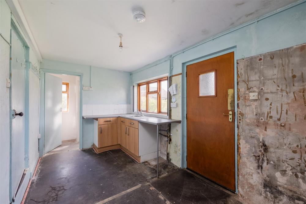 Rear aspect timber frame window, base mounted units, stainless steel sink and drainer, door to outside rear.