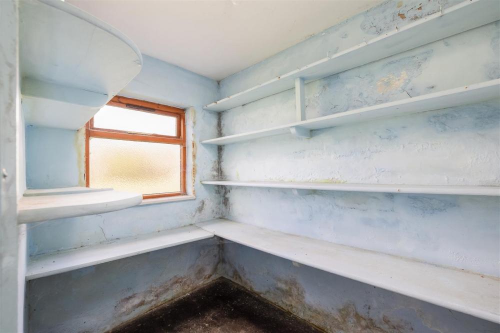 Rear aspect timber frame opaque window, shelving.